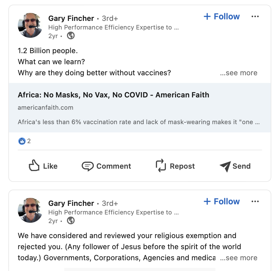 Fincher does use his LinkedIn profile to spread anti-vaccination misinformation and messages about his religious fears, however. Is that the worship Gary Fincher is leading… LinkedIn posts?